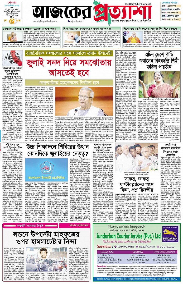 সোমবার ১৫ সেপ্টেম্বর ২০২৫ ঢাকা ৩১ ভাদ্র ১৪৩২ বঙ্গাব্দ ২১ রবিউল আউয়াল ১৪৪৭ রেজি.নং-ডিএ-১৩৯৯
