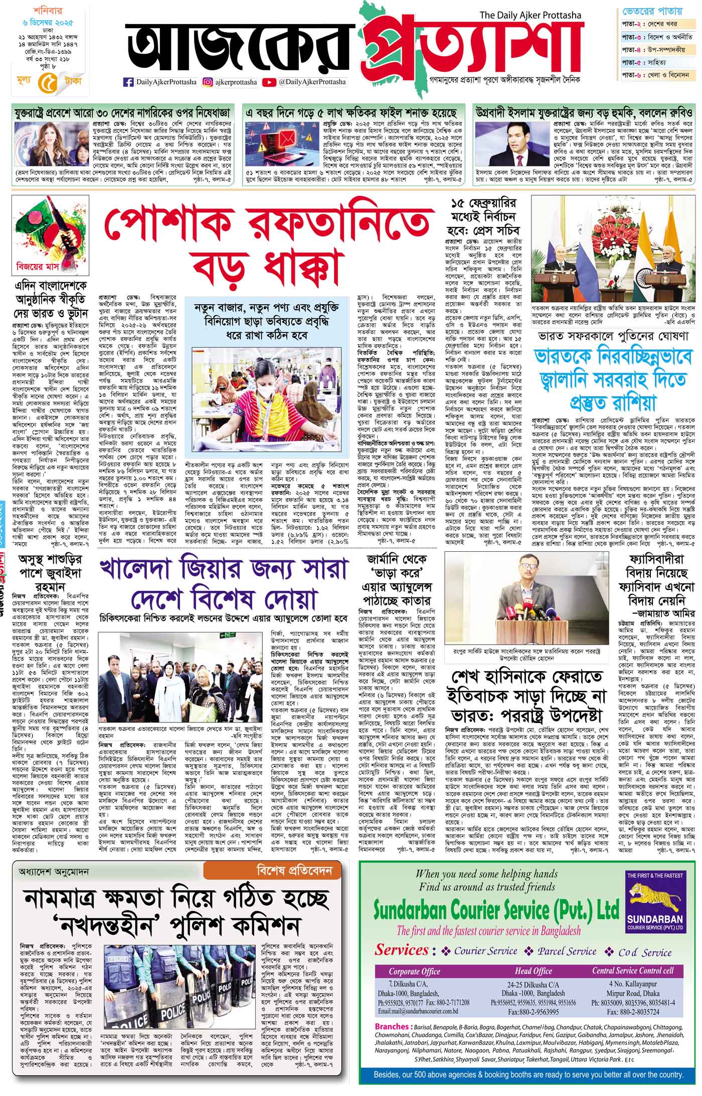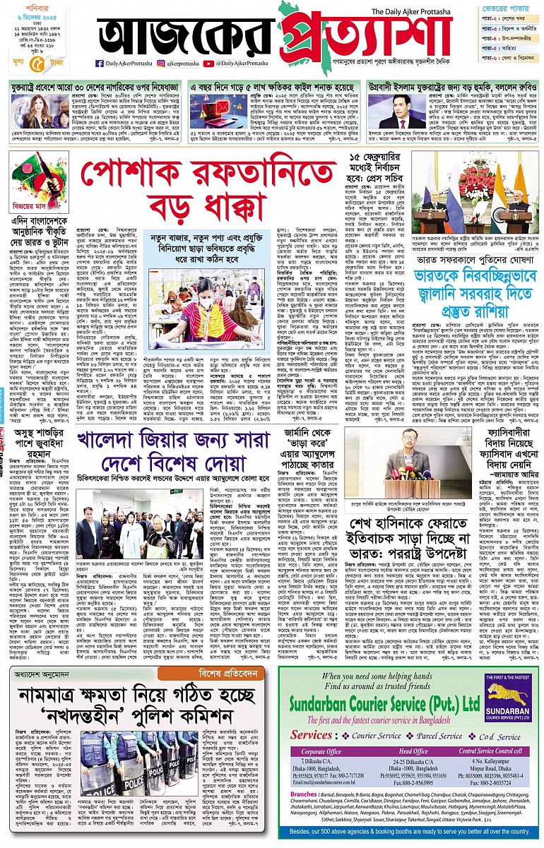 শনিবার ৬ ডিসেম্বর ২০২৫ ঢাকা ২১ অগ্রহায়ণ ১৪৩২ বঙ্গাব্দ ১৪ জমাদিউস সানি ১৪৪৭ রেজি.নং-ডিএ-১৩৯৯