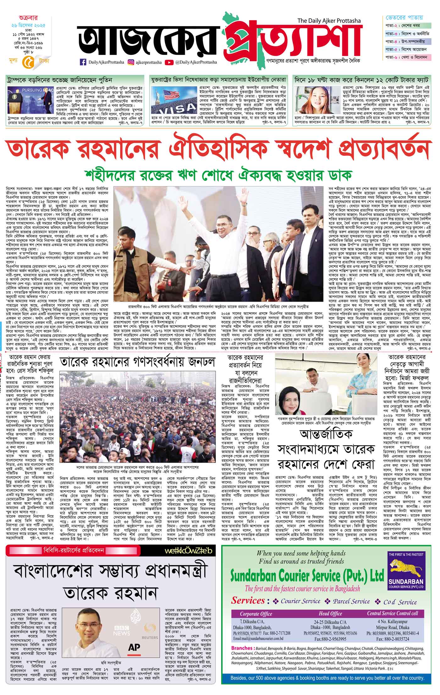 শুক্রবার ২৬ ডিসেম্বর ২০২৫ ঢাকা ১১ পৌষ ১৪৩২ বঙ্গাব্দ ৫ রজব ১৪৪৭ রেজি.নং-ডিএ-১৩৯৯