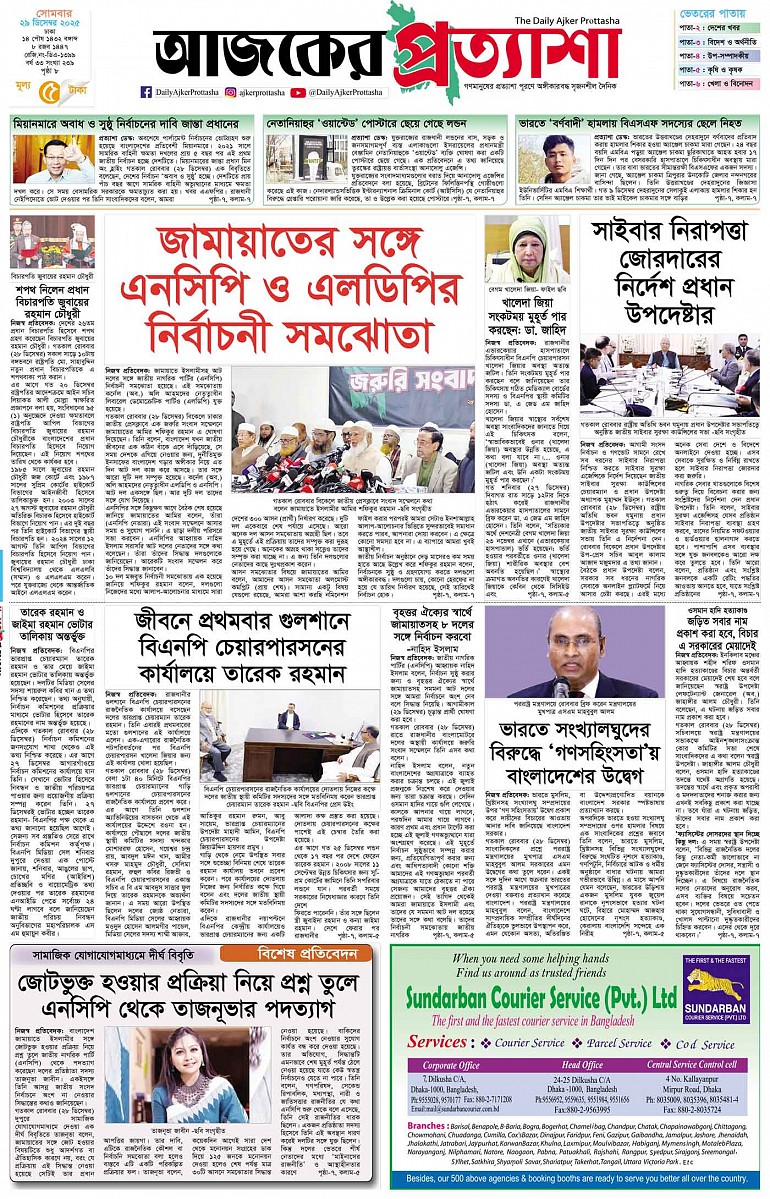 সোমবার ২৯ ডিসেম্বর ২০২৫ ঢাকা ১৪ পৌষ ১৪৩২ বঙ্গাব্দ ৮ রজব ১৪৪৭ রেজি.নং-ডিএ-১৩৯৯